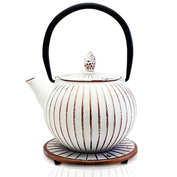 Quality Cast Iron Teapot - Anyang White with Gold Stripe, 850ml (SS Mesh Strainer and Base Trivet Included).