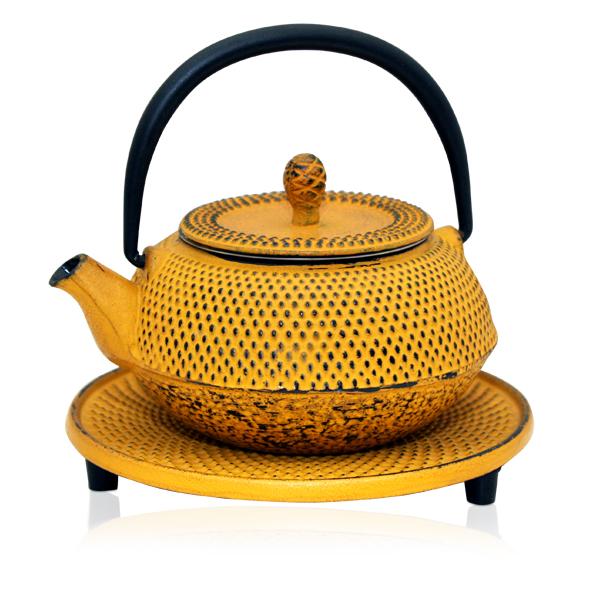 Quality Cast Iron Teapot - Moto Yellow 300ml (mesh strainer and trivet included).