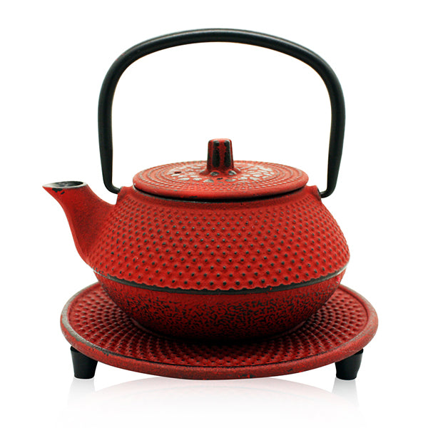 Quality Cast Iron Teapot - New Moto Red 300ml (mesh strainer and trivet included).