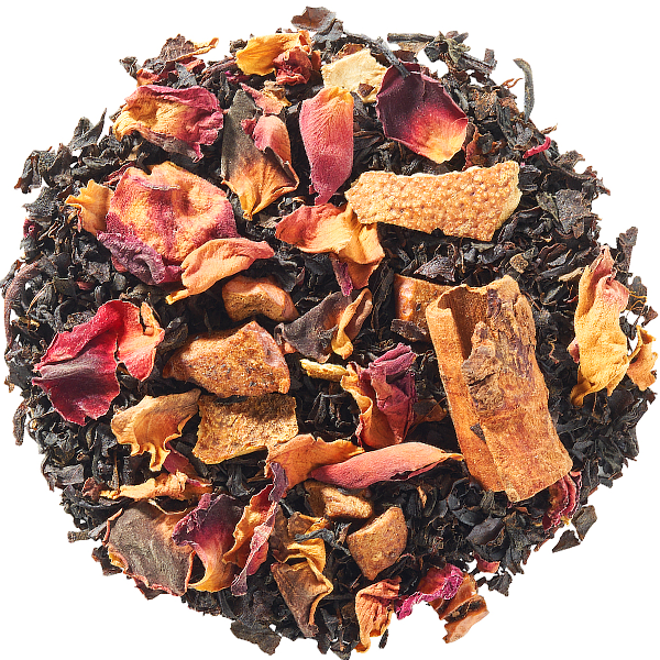 Christmas tea: Black tea, cinnamon quills, apple pieces, sweet orange peel, rose petals, natural flavour.