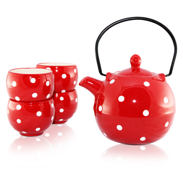 Polka Dot Red Teapot and 4 Cup Set 600ml (filter included). Set comes in quality black giftbox.