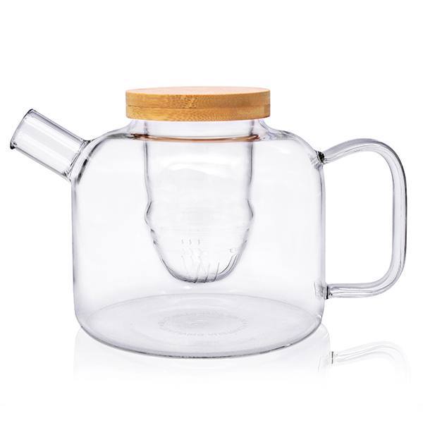 Bamboo Lid Glass Teapot 800ml (with removable glass infuser basket). Quality heat resistant glass. Easy to use design, with modern natural styling. Well suited with our White Ceramic Teapot Warmer.