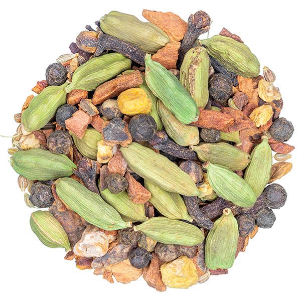 Cardamom, cinnamon, cloves, black pepper, anise, ginger root, nutmeg.