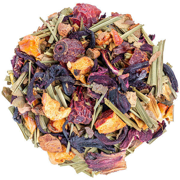 Apple pieces, hibiscus, strawberry leaves, lemongrass, rosehip, cinnamon, liquorice root.