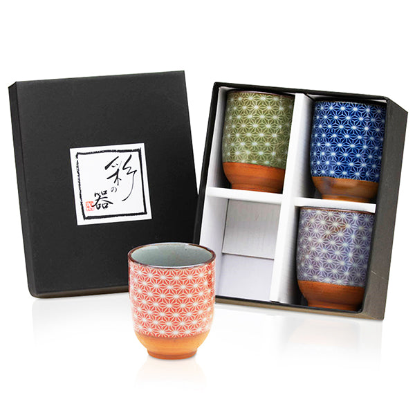 Quality Japanese 4 Tea Cup Gift Set – Stoneware tea cups featuring our traditional Japanese Kira 'hemp leaf' pattern in four assorted colours. Presented in a black Zenware gift box.