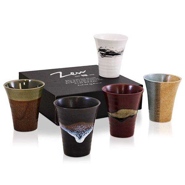 Quality Japanese 5 Tumbler Gift Set - Ceramic Handcrafted Tumblers with earthenware finish, in Japanese assorted colours. Set comes in black Zenware giftbox.