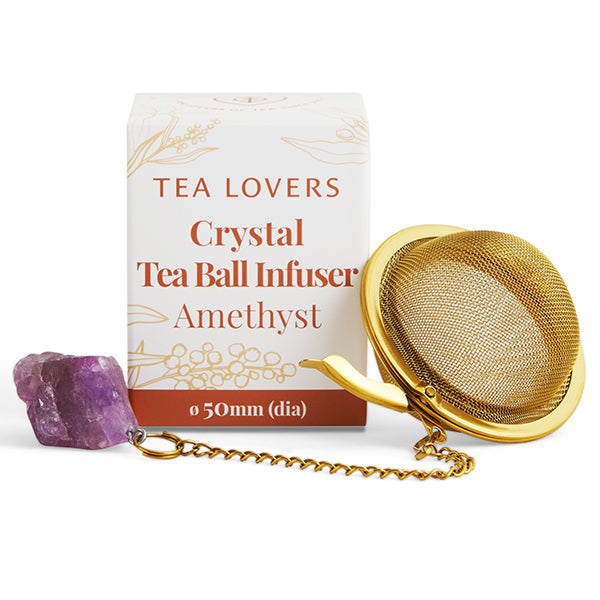 Gold-Plated Stainless Steel Tea Infuser Ball on Chain 50mm with Crystal Rock Charm (Amethyst Purple).