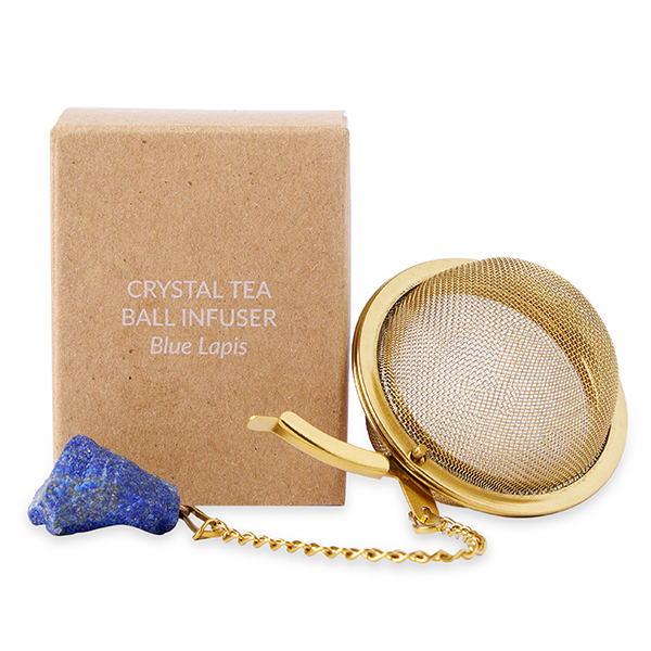 Gold-Plated Stainless Steel Tea Infuser Ball on Chain 50mm with Crystal Rock Charm (Blue Lapis).