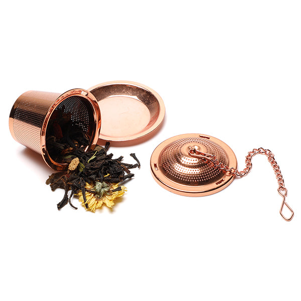 Stainless Steel Tea Infuser Basket on Chain (with Rose Gold Finish). Comes with drip saucer for easy use. Size: Basket Dia 45mm, Basket Depth 40mm, Chain Length 11cm.
