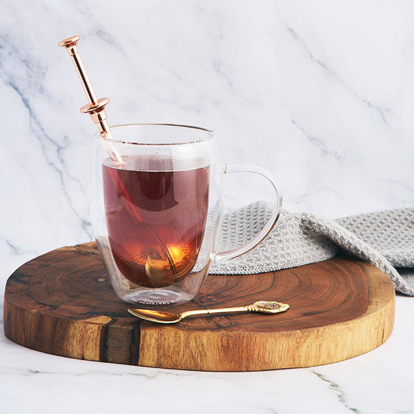 A sleek wand for effortless single serve brewing. Stainless steel with a rose gold finish. Press the handle to open the tea ball, add 1 to 2 teaspoons of loose leaf tea, close, then swirl and steep. The slim design sits neatly in a cup or tall mug. It also works for a light cold brew fruit infusion to gently flavour iced soda. Swizzle your way to the perfect infusion with our new Leaf Wand.