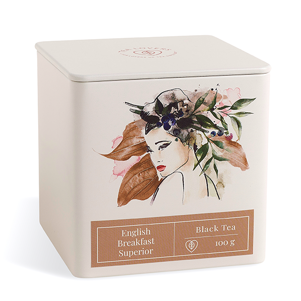 Tea Lovers Superior 'English Breakfast' black tea loose leaf, elegantly presented in a charming 100g gift tea tin.